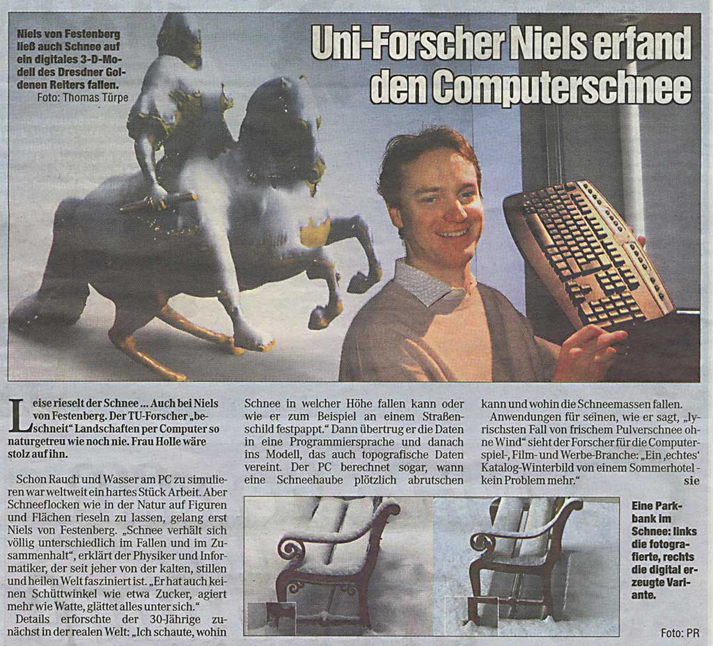 Die automatische Beschneiung virtueller Landschaften hat Niels v. Festenberg an der Professur Computergraphik und Visualisierung bearbeitet. Sie ist ein gutes Beispiel für die Spielräume, die guter Algorithmus bei der Erzeugung von digitalen Inhalten bereithält. Neben effizienter Implementierung ist dabei von entscheidender Bedeutung, eine gute physikalische Modellvorstellung zu finden. Bei der Schneedeckenerzeugung ist das zugrundeliegende Modell ein Diffusionsprozess.