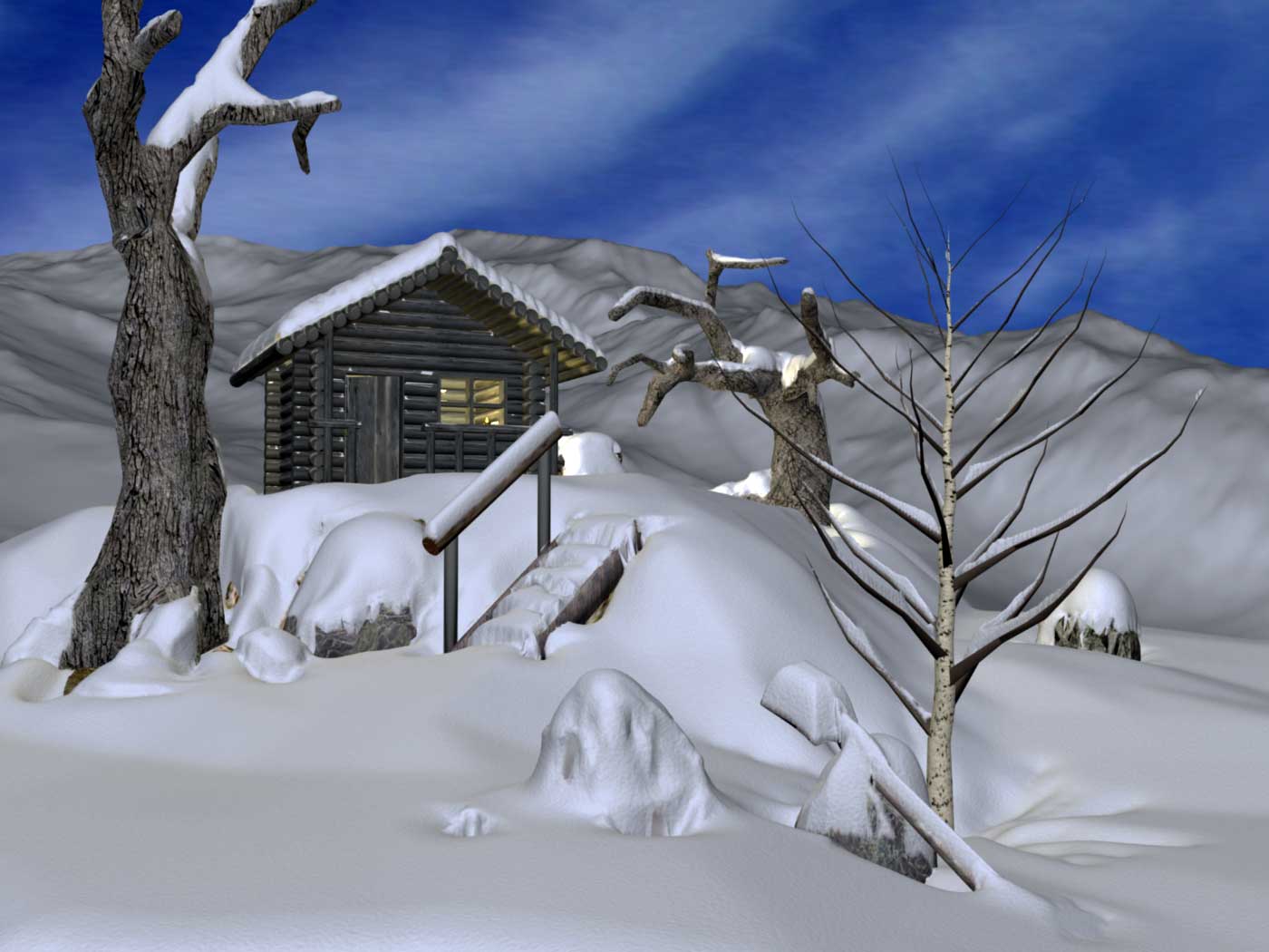 Eine virtuelle Landschaft mit algorithmisch erzeugter Schneebedeckung. Fahren Sie mit der Maus über das Bild, um die Schneedecke zu sehen. Der Fachartikel dazu ist Computer Graphics Forum (Vol. 30, Nr. 6, 2011) erschienen.